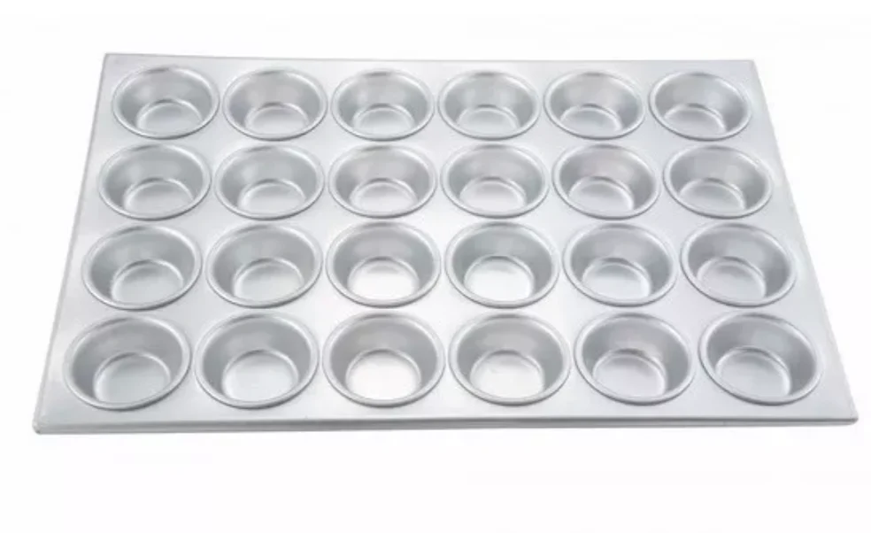 Este molde para muffins cuenta con 24 cavidades que son perfectos para panaderías, restaurantes u otros procesos alimenticios que producen pasteles u otros postres.